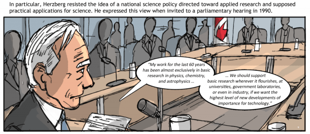 Weighing in on the debate of shifting focus from basic research to applied research Herzberg wrote: „There are clearly two principal reasons for the support of pure science in Canada, and elsewhere. One is strictly mercenary. Experience has shown that pure science represents the goose that lays the golden eggs; it helps applied science and technology in their development as I have tried to exemplify by the examples given earlier. Many people do not seem to appreciate this point fully. The other reason for support of pure science by government funds is that scientific research of the purest kind is an intellectual activity which, just like art, music, literature, archaeology, and many other fields, helps us to understand who we are, and what is the nature of the world in which we live.“