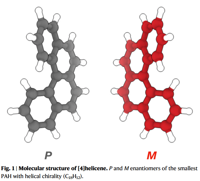 The first work is on the cluster of so-called [4]helicene molecules. Helicenes are polycyclic aromatic hydrocarbons (PAHs) which I have written about previously (link Marie Curie stuff) but helicenes are really neat and interesting for another reason. Just to clarify, the number 4 in [4]helicene is the number of hexagonal benzene rings in the molecule, and [4]helicene is the smallest helicene which is chiral, i.e., it has non-superimposable mirror images. Which is really interesting because usually when chirality is taught in chemistry classes it is taught from the point of view of a single carbon atom connecting four different groups. However, in [4]helicene there are no such carbon atoms. So how could it be chiral??