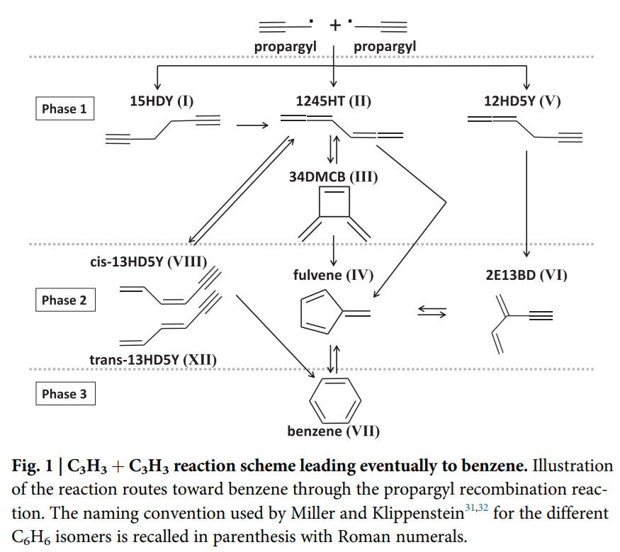 The second paper I wanted to briefly highlight, published in Communications Chemistry, was actually the first SOLEIL proposal I wrote when I started as a postdoc there in 2017, and carried out my part of the experiments in 2018. This paper is also closely linked to PAHs, but here we investigated the formation of benzene with propargyl radicals (C3H3). When two propargyl radicals react, a very complex series of events follow as depicted in the reaction scheme here below.